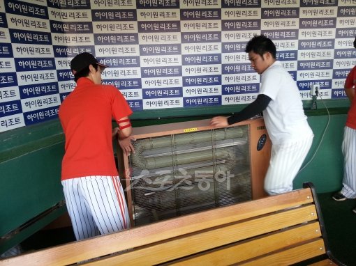 갑자기 추워진 날씨 탓에 덕아웃에 등장한 난로. 사직 | 이경호 기자 rush@donga.com 트위터 @rushlkh