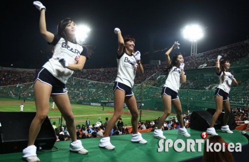 `2012 팔도 프로야구` 롯데자이언츠와 두산베어스의 준플레이오프 4차전 경기가 12일 오후 부산 사직야구장에서 열렸다. 두산 치어리더들이 이닝교체 타임을 이용해 멋진 공연을 펼치고 있다.