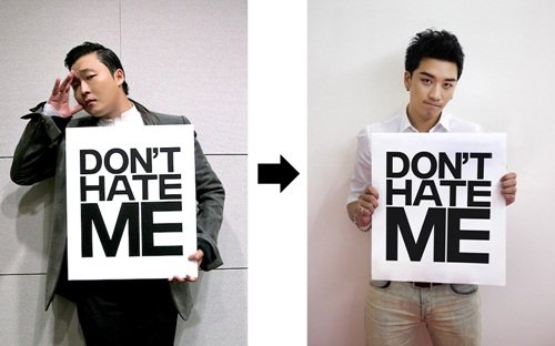 16일 오전 YG엔터테인먼트(이하 YG)의 공식 블로그 YG라이프(http://www.yg-life.com)에는 승리가 같은 소속사 선배 싸이에게 ‘돈트 해이트 미(Don't hate me)’라고 적혀 있는 피켓을 전달받은 이미지를 공개했다.