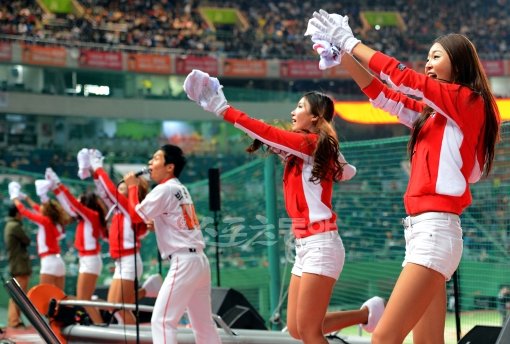16일 저녁 인천 문학야구장에서 열린 2012 프로야구 SK와 롯데의 플레이오프 1차전에서 SK 응원단이 응원을 펼치고 있다.