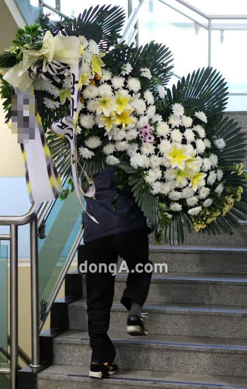 17일 오후 서울 순천향대병원 장례식장에서 한 관계자가 근조화환을 쿨 김성수의 전 아내인 강모씨의 빈소로 옮기고 있다.