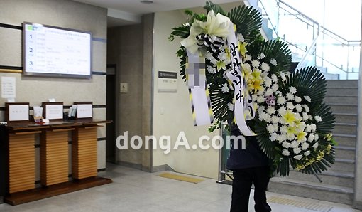 17일 오후 서울 순천향대병원 장례식장에서 관계자가 근조화환을 쿨 김성수의 전 아내인 강모씨의 빈소로 옮기고 있다.