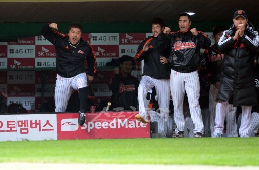 10회초 롯데 타자 정훈이 볼넷으로 밀어내기에 성공하자 롯데 선수들이 환호하고 있다. 문학ㅣ박화용 기자 inphoto@donga.com 트위터 @seven7sola