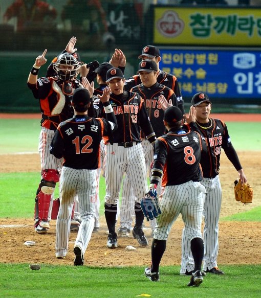 17일 오후 인천 문학야구장에서 열린 ‘2012 팔도 프로야구 PO 2차전’ SK 와이번스와 롯데 자이언츠의 경기에서 롯데가 연장접전끝에 SK에 5-4 한점차 승리를 거두며 시리즈 1승 1패로 승부를 원점으로 만들었다.