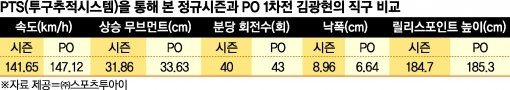 김광현은 7월 어깨통증 재발로 엔트리에서 빠졌다가 복귀한 뒤 하향 페이스였다. 9월 3경기 방어율은 8.79. 무엇보다 구위 저하가 문제였다. 9월 7일 광주 KIA전(2.1이닝 7실점)에선 직구 최고 구속이 143km, 평균 구속이 138km에 불과했다. 이전 상황만 놓고 보면, “(김)광현이가 나온다고 했을 때 ‘땡큐’라고 생각했다”는 롯데 모 코치의 말이 허풍만은 아니었다. 그러나 김광현은 PO 1차전에서 직구 최고 구속 151km, 평균 구속 147km를 찍었다. 정규시즌 16차례의 등판과 비교할 때 가장 높은 수치였다. 스포츠통계기록전문회사 ㈜스포츠투아이에 따르면, 이날 직구의 평균 구속(141.65km→147.12km), 상승 무브먼트(31.86cm→33.63cm), 분당 회전수(40회→43회), 릴리스포인트 높이(184.7cm→185.3cm)는 정규시즌과 비교할 때 모두 올랐다. 롯데 양승호 감독은 17일 2차전을 앞두고 “1회만 보고 타격코치와 ‘오늘 큰 일 났다’는 얘길 나눴다”고 털어놓았다.
