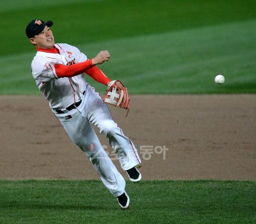17일 인천 문학야구장에서 열린 2012 프로야구 플레이오프 2차전 SK와이번스 대 롯데자이언츠 경기에서 SK 박진만 수비. 문학|김종원기자 won@donga.com 트위터 @beanjjun