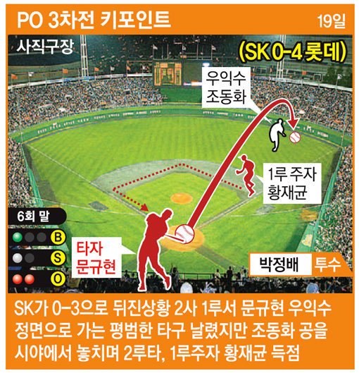 19일 플레이오프(PO) 3차전, SK가 0-3으로 뒤진 6회말 2사 1루. 롯데 문규현의 타구는 우측 외야로 날아갔다. SK 우익수 조동화가 충분히 잡을 수 있는 타구였다. 그러나 공은 조동화의 머리 위로 넘어갔다. 조명 속으로 타구가 들어간 듯 보였다. ‘공짜 적시 2루타’로 순식간에 점수는 4-0으로 벌어졌고, SK의 추격의지는 한풀 꺾였다.