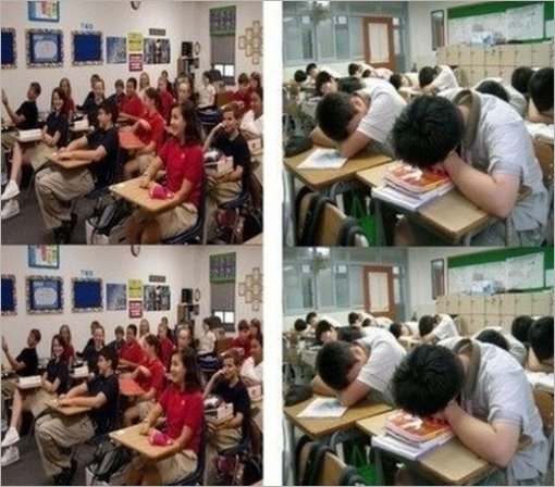 외국 학생은 활기찬 모습에 정자세로 앉아 수업을 받는 것에 비해 한국 학생은 엎드려 잠을 청하고 있는 모습.