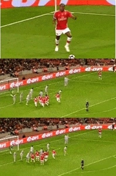 공개된 영상 속에는 한 축구선수가 프리킥 기회를 얻어 슛을 준비하고 있다. 이 선수는 슛 동작을 취한 다음 바로 멈춰 다른 선수들을 교란시키고 있다.