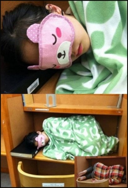 여기서 중요한 것은 여학생이 잠들어 있는 곳이 다름 아닌 도서관 책상 위라는 것. 집까지 가지 못하고 도서관 책상 위에서 잠든 것이다.