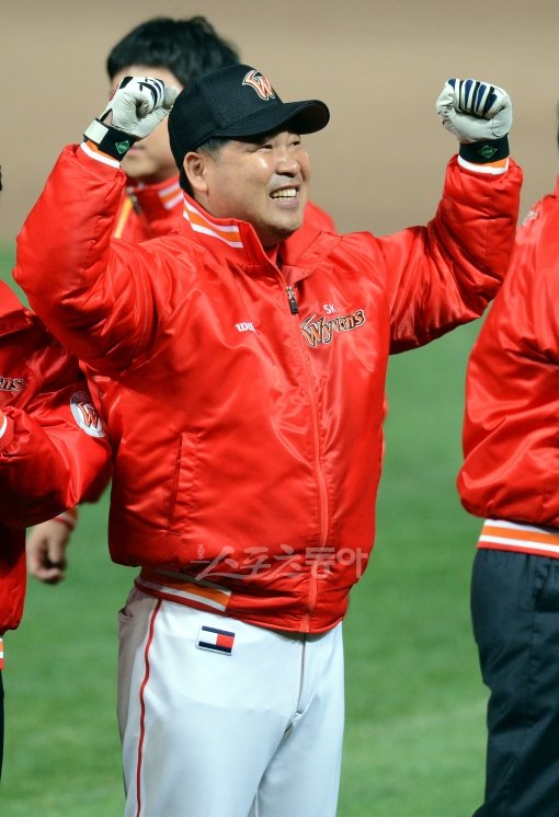 22일 인천 문학야구장에서 열린 2012 프로야구 플레이오프 5차전 SK와이번스 대 롯데자이언츠 경기에서 6-3 승리를 거두며 플레이오프 전적 3승 2패를 기록해 한국시리즈 진출을 확정지은 후 SK 이만수 감독이 기뻐하고 있다.