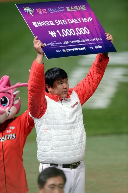 22일 인천 문학야구장에서 열린 2012 프로야구 플레이오프 5차전 SK와이번스 대 롯데자이언츠 경기에서 5차전 MVP 채병룡.