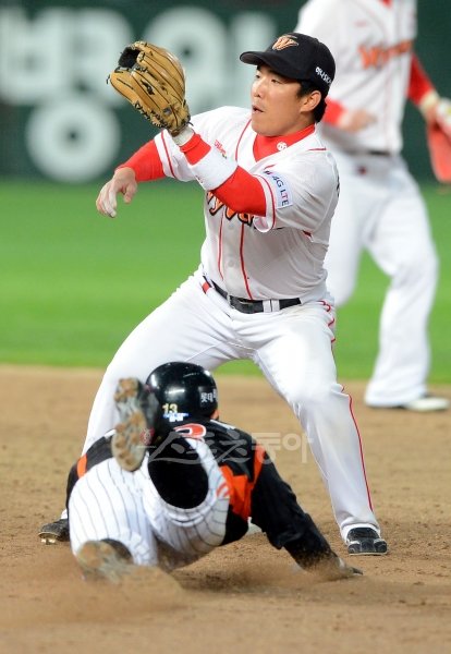22일 저녁 인천 문학 야구장에서 열린 2012 프로야구 SK와 롯데의 플레이오프 5차전에서 3회초 2사 1루 롯데 타자 김주찬 타석때 1루 주자 황재균이 2루 도루를 시도하고 있다. 결과는 정근우의 태그에 아웃. 문학ㅣ박화용 기자 inphoto@donga.com 트위터 @seven7sola