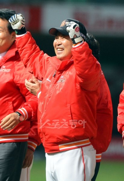 22일 저녁 인천 문학 야구장에서 열린 2012 프로야구 SK와 롯데의 플레이오프 5차전에서 SK가 6-3으로 승리를 거두고 한국시리즈에 진출했다. 경기종료 후 SK 이만수 감독이 관중들에게 주먹을 지며 인사를 하고 있다. 문학ㅣ박화용 기자 inphoto@donga.com 트위터 @seven7sola