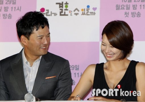 배우 김성민, 정애연(오른쪽)이 22일 오후 서울 동대문 메가박스에서 열린 jtbc 드라마 ‘우리가 결혼할 수 있을까’ 제작보고회에 참석해 대화를 나누고 있다.