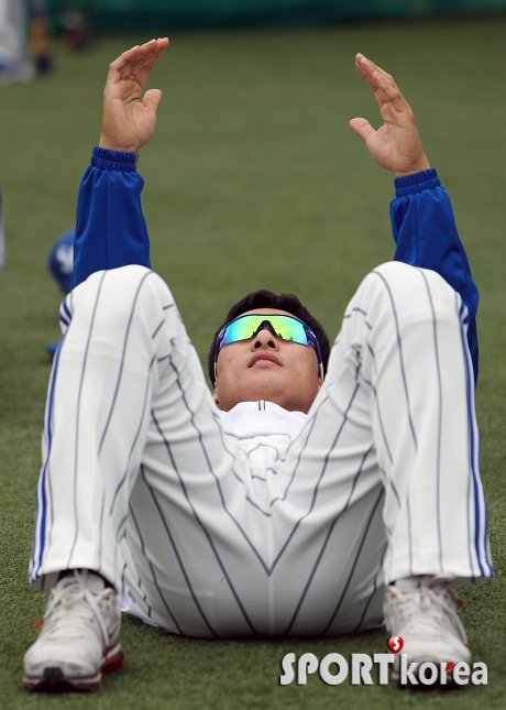 24일 오후 삼성 라이온즈와 SK 와이번즈의 한국시리즈 1차전이 열리는 대구 시민구장에서 삼성 이승엽이 스트레칭하며 몸을 풀고 있다. ‘국민타자’ 삼성 이승엽(36)은 지난 2002년 이후 10년만에 한국시리즈 무대에 올랐다.