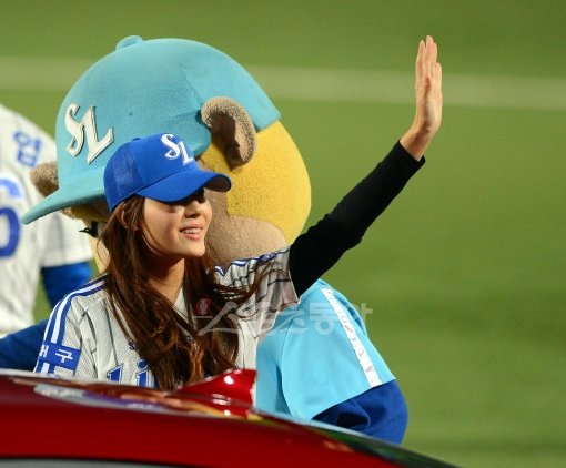 24일 저녁 대구 시민야구장에서 열린 2012 프로야구 삼성과 SK의 한국시리즈 1차전 경기에서 탤런트 김하늘이 시구를 하고 있다.