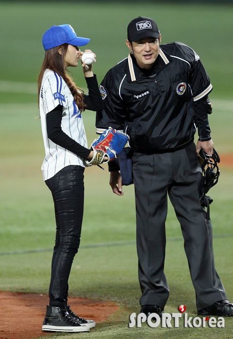 24일 오후 대구 시민구장에서 열린 `2012 팔도 프로야구` 삼성 라이온즈와 SK 와이번즈의 한국시리즈 1차전에서 탤런트 김하늘이 시구하기에 앞서 나광남구심에게 조언을 구하고 있다.