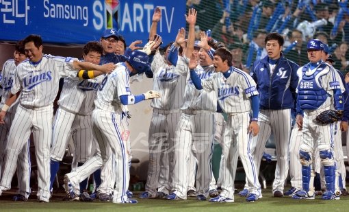 24일 대구 시민야구장에서 열린 2012 프로야구 한국시리즈 1차전 삼성라이온즈 대 SK와이번스 경기 7회말 1사 2루 삼성 배영섭 중전 안타 때 2루주자 강명구가 홈까지 달려 세이프 된 후 덕아웃에서 하이파이브 하고 있다. 대구 | 김종원기자 won@donga.com 트위터 @beanjjun
