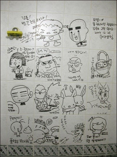 공개된 사진은 화장실 벽면 하얀 타일에 그려 넣은 만화를 촬영한 것으로, 각종 인기 만화의 캐릭터들이 생생하게 그려져 있어 눈길을 끈다.