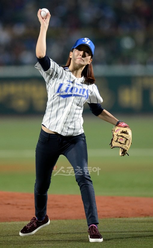 25일 대구 시민야구장에서 열린 2012 프로야구 한국시리즈 2차전 삼성라이온즈 대 SK와이번스 경기 전 탤런트 윤세아가 시구를 하고 있다.
