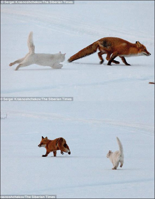 괴력의 고양이를 포착한 사진작가 세르게이 크라스노스체코브는 “이 고양이는 자신의 영역에 들어오는 동물들에게는 매우 사납지만 인간에게는 친화적이다”라며 “아마도 여우와 싸웠다기보다는 놀이삼아 장난을 친 것 같다”고 설명했다.