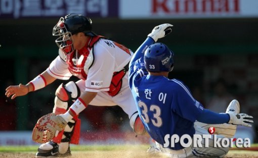 28일 오후 인천 문학구장에서 열린 ‘2012 팔도 프로야구’ 삼성 라이온즈와 SK 와이번즈의 한국시리즈 3차전 삼성 5회초 2사 1루에서 7번 조동찬의 2루타 때 1루주자 박한이가 홈까지 파고들어 SK 포수 조인성의 태그에 앞서 세이프 되고 있다.
