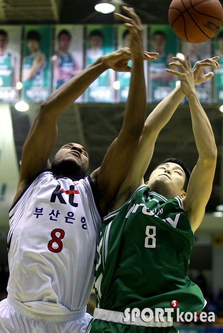 ‘2012 KB 국민카드 프로농구’ 원주 동부 프로미와 부산 KT 소닉붐의 경기가 28일 오후 원주 치악체육관에서 열렸다. KT 타운스와 동부 박지훈이 리바운드 볼을 다투고 있다.