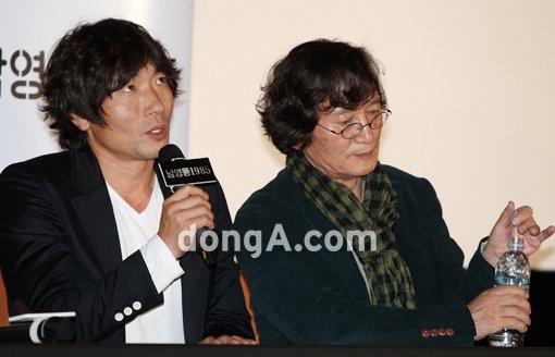 배우 박원상(왼쪽)이 5일 오후 서울 동대문 메가박스에서 열린 영화 ‘남영동1985’ 언론시사회에서 취재진의 질문에 답변을 하고 있다.