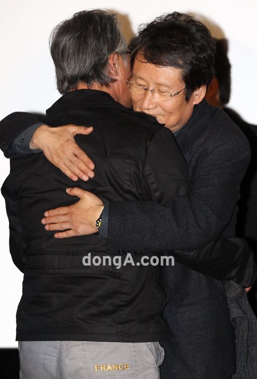 배우 이경영(왼쪽)과 문성근이 5일 오후 서울 동대문 메가박스에서 열린 영화 ‘남영동1985’ 언론시사회에서 기자간담을 마치고 포옹을 하고 있다.