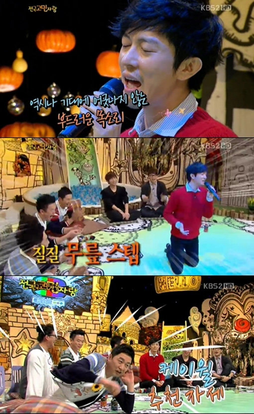 윤건은 5일 방송된 KBS 2TV ‘대국민 토크쇼 안녕하세요’(이하 안녕하세요)에 출연해 무릎을 꿇고 노래를 불러 웃음을 선사했다.