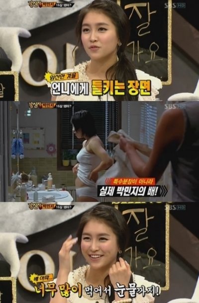 박민지는 "밥을 정말 많이 먹었다. 두 세 그릇을 먹고 애가 너무 배가 부르니까 눈물까지 나더라. 분장이 아난 진짜 내 배로 촬영했다"고 설명했다.