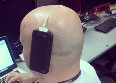 공개된 사진에는 머리카락이 없는 한 외국인 남성이 케이블을 연결한 스마트폰을 머리위에 올려 놓고 있어 웃음을 자아냈다.