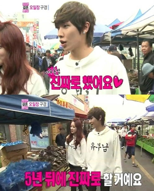이날 오연서와 이준은 각각 ‘유부녀’, ‘유부남’이라고 적힌 커플티를 입고, 수갑을 찬 뒤 다정하게 시장 거리를 거닐었다.