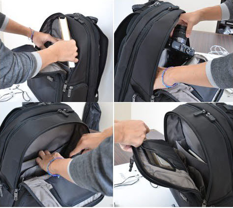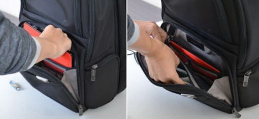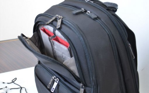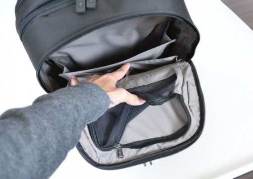 위 사진처럼 가방을 펼쳐놓고 검색을 받으면 된다. 노트북 수납공간에 손이 비치는 것처럼 속의 내용물을 육안으로도 확인할 수 있게 되어 있다.