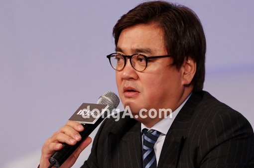 정태원 대원엔터테인먼트 대표가 13일 오후 서울 강남구 리츠칼튼호텔에서 열린 KBS 2TV ‘아이리스2 쇼케이스’에서 취재진의 질문에 답변을 하고 있다.