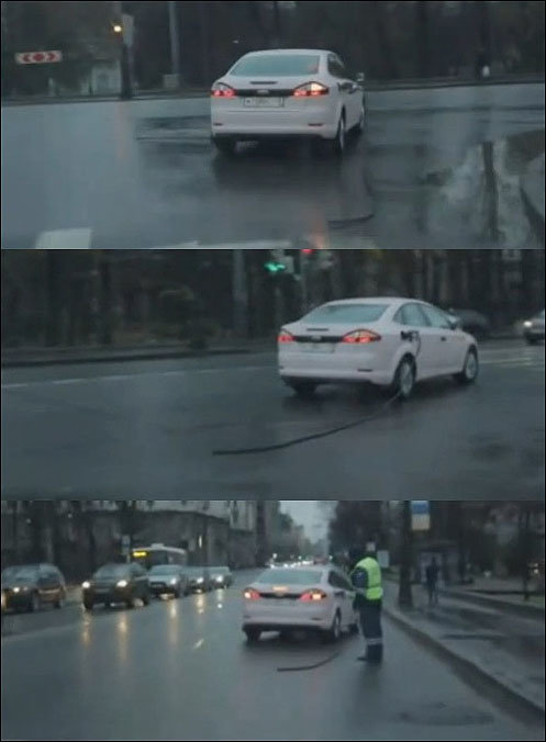 공개된 영상에는 주유 호스를 빼지 않고 주행을 하고 있는 승용차의 모습이 담겨 있다. 차 주인이 셀프 주유소에서 주유를 한 뒤 호스를 빼는 것을 잊고 출발한 것으로 보인다.