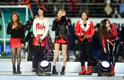 14일 오후 경기도 화성종합경기장에서 열린 '대한민국과 호주'의 축구국가대표팀 친성경기에서 하프타임때 f(x)가 인사를 하고 있다.