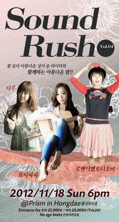 소니뮤직이 진행하는 브랜드 콘서트 ‘사운드 러시’의 네 번째 공연이 타루, 로지피피, 로맨틱멜로디초비가 참가하는 가운데 18일 오후 6시 서울 서교동 공연장 프리즘에서 열린다.