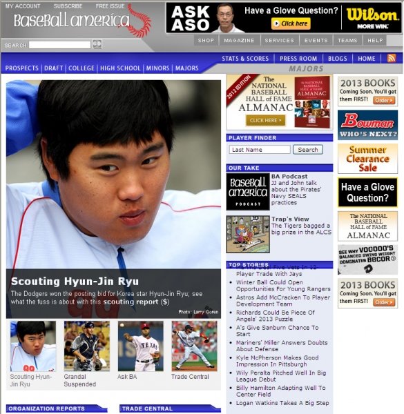 류현진의 스카우팅 리포트를 게재한 베이스볼아메리카 홈페이지 메인 화면. 베이스볼아메리카는 15일(한국시간) 류현진이 LA 다저스에서 3선발을 충분히 맡을 수 있을 것으로 전망했다.