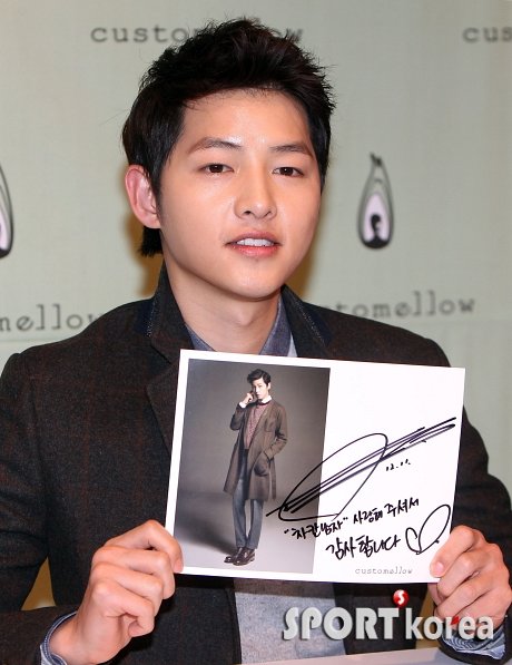 배우 송중기가 16일 오후 서울 마포구 커스텀 멜로우 에이치 스토어에서 열린 재능기부 사인회에 참석해 자신의 사인지를 들고 있다.