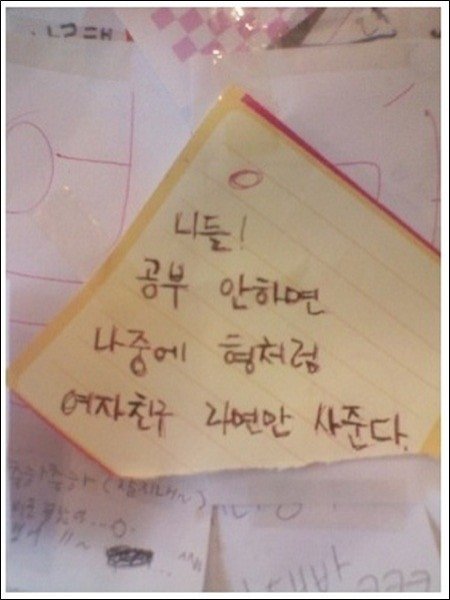 이 메모지에는 “너희들! 공부 안하면 나중에 형처럼 여자친구 라면만 사준다”라는 웃지 못할 메시지가 담겨져 있다.