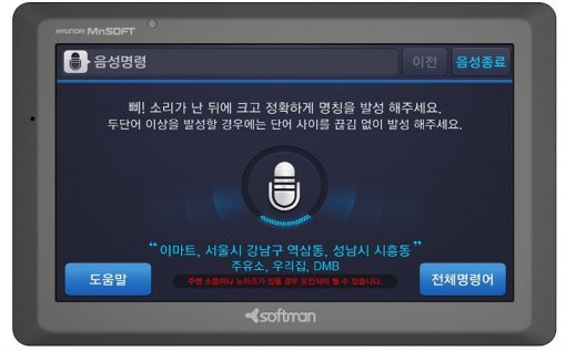 현대엠엔소프트의 ‘소프트맨 내비게이션’ S570V모델은 음성 인식 기능을 갖췄다. 음성만으로 검색부터 경로안내, 볼륨조절, 밝기 조정, DMB 채널조정 등 모든 조작이 가능하다.