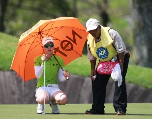 16일 싱가포르 라구나 내셔널골프장(파72)에서 열린 ADT캡스 챔피언십 2라운드 5번 홀 그린에서 김자영이 캐디와 함께 신중한 표정으로 퍼트 라인을 살피고 있다. 사진제공|KLPGA