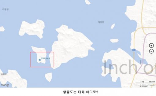 서울을 떠나 인천을 살펴봤다. 그래도 인천국제공항은 표시돼 있다. 하지만 영종도와 영종대교는 온데간데 없다. 이 지도에 따르면, 인천국제공항은 배로 접근해야 한다. 이를 본 외국인이 어떤 생각을 할지 문뜩 궁금하다. 여기에 비하면 서해가 태평양으로 표기된 것은 차라리 애교다.