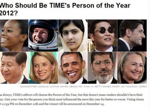 27일(한국시간) 미국의 시사주간지 타임지는 싸이를 타임지 올해의 인물(Person of the Year 2012) 후보로 지명했다고 밝혔다.