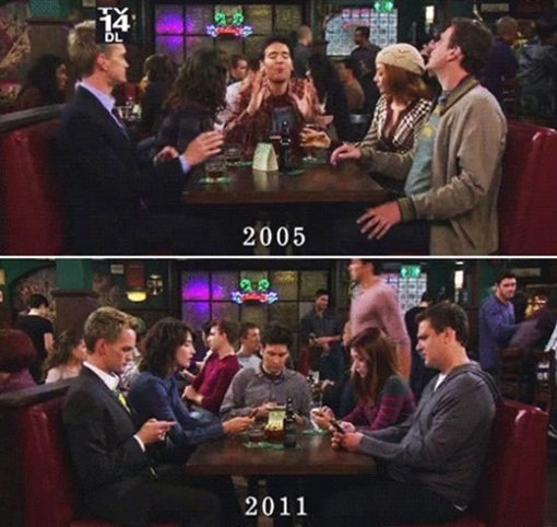 2005년도에는 사람들끼리 만나면 즐겁게 이야기를 나눴지만 2011년도에는 각자 휴대폰을 들여다보고 있다.
