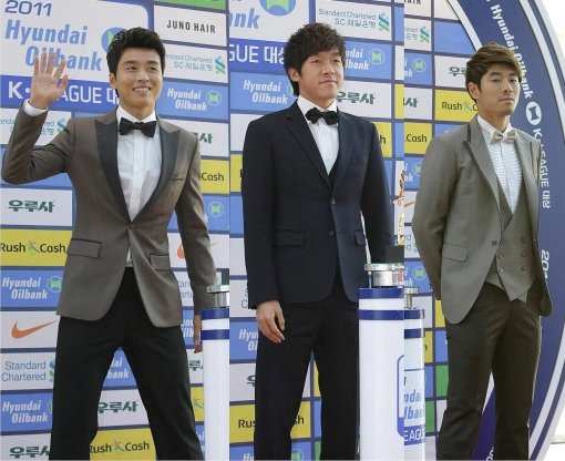 지난 시즌 시상식에서 포즈를 취한 이동국(전북현대), 황진성(포항스틸러스), 하대성(FC서울) 선수(왼쪽부터).