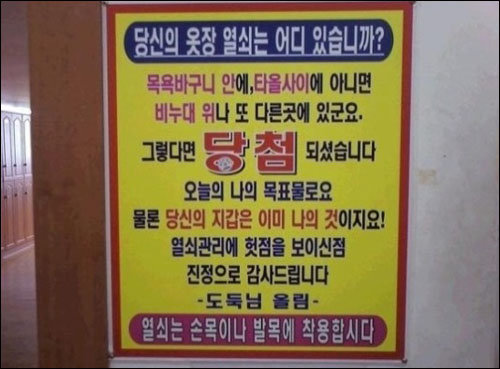 ‘여탕에 붙은 경고문’을 접한 누리꾼들은 “열쇠 잃어버리면 만원!”, “여탕에 붙은 경고문 센스 만점”, “열쇠 잃어 버린 경험 누구나 다 있을 듯”등의 반응을 보였다.