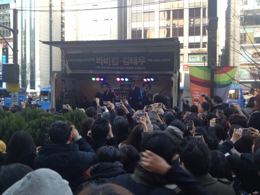 이날 게릴라콘서트는 바비킴과 김태우가 최근 듀엣곡 '그런 걸(Girl)'을 발표한 가운데 오는 25일 열리는 '2012 더 보컬리스트' 콘서트를 팬들에게 알리기 위해 감행됐다.